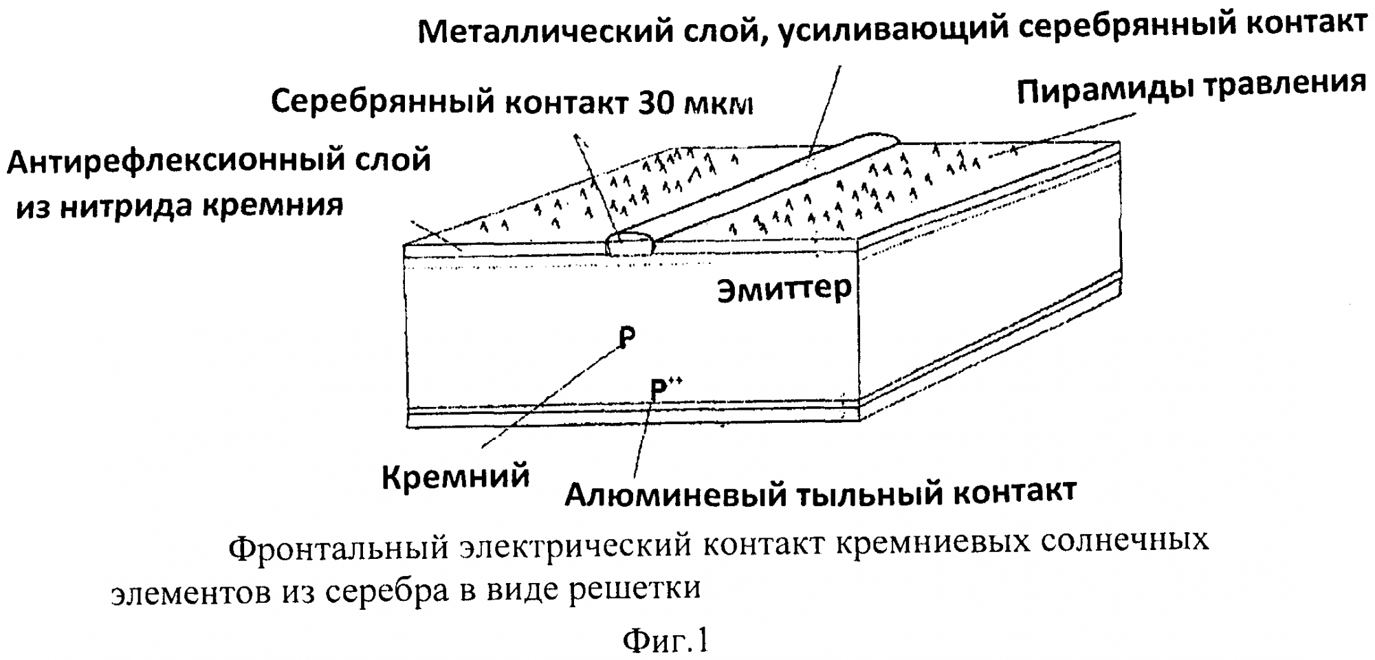Технический результат изобретения — уплотнение фронтального электрического контакта солнечного элемента осаждением металла, в частности меди, с хорошей электрической проводимостью. Использование изобретения позволяет повысить эффективность работы солнечного элемента при преобразовании излучения высокой плотности и уменьшить себестоимость его изготовления.