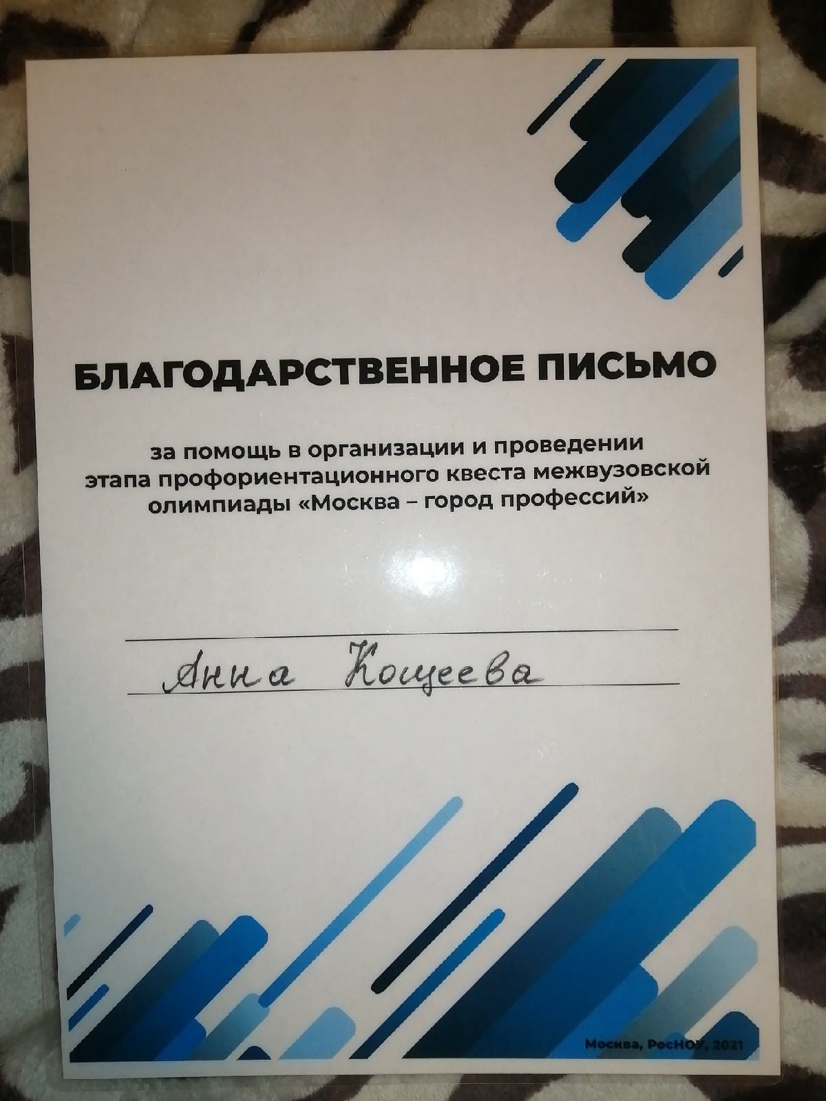 Аня — очень ответственный человек, она действительно достойна этой награды. Она вложила много сил в участие во всех вышеперечисленных мероприятиях. Аня командный игрок, всегда поддерживает своих сокомандников, создает дружескую атмосферу в любом коллективе. Она — лидер в любой игре, который уверенно ведет свою команду к победе. Аня очень яркая личность, у нее множество идей и проектов, которые она успешно реализует. Она ответственно подходит к каждому мероприятию, на нее всегда можно положиться, Аня всегда готова прийти на помощь. Из любой трудной ситуации она найдет выход, с удовольствием преодолевая трудности. Она — достойный представитель как своего института ЭУиФ, так и университета РосНОУ в целом.