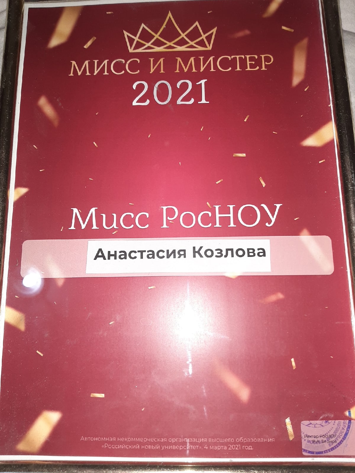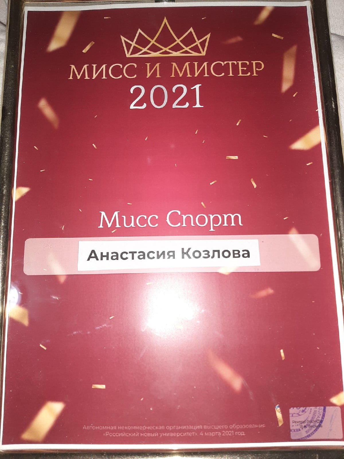 Анастасия проявила свой творческий потенциал в разных мероприятиях вуза и межвузовских конкурсах. Несмотря на то, что год был тяжёлым, было сложно собрать команду по КВНу из-за дистанционного обучения (первокурсники не смогли в полной мере познакомиться) была собрана команда института бизнес-технологий, которая одержала победу. Также Настя победила в главном конкурсе университета «Мисс и Мистер РосНОУ 2021», в котором оцениваются не только творческие способности участника, но и интеллектуальный уровень, социальная ориентированность и спортивная подготовка (социальный ролик был одним из лучших). В ежегодном конкурсе талантов РосНОУ Настя заняла 1 первое место в танцевальном направлении. В настоящее время Настя находит время совмещать обучение с интенсивной подготовкой в женской сборной КВН «За гранью», представляющей университет в мероприятиях главного и массового студенческого движения КВН (уже достигнуты первые результаты, сборная прошла в МСЛ2).
