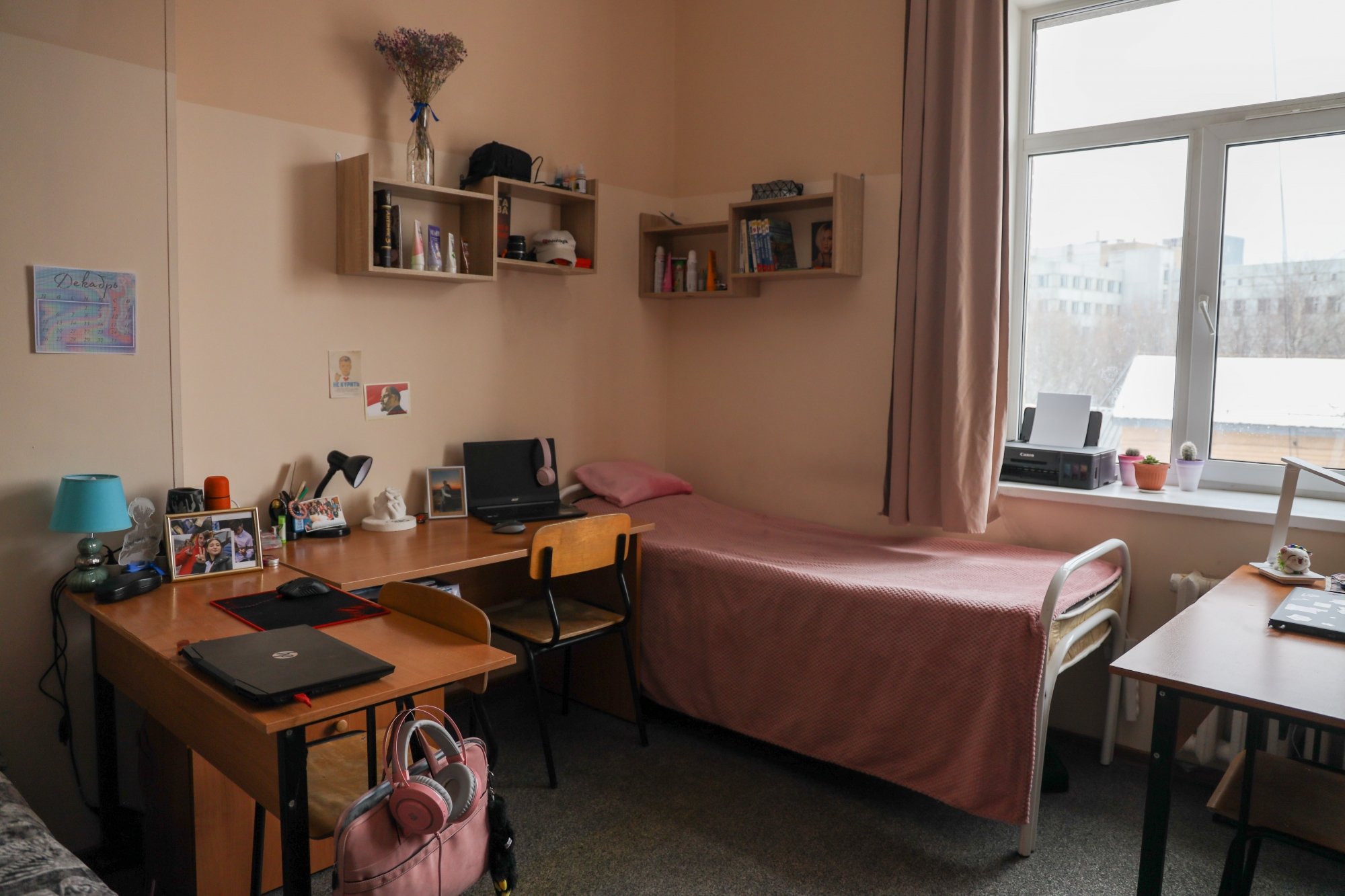 В комнатах установлена необходимая мебель: кровати, шкафы, тумбочки, холодильник. Утюги, фены и прочую технику студенты могут привозить сами. С разрешения администратора можно устанавливать дополнительные шкафы, вешать полки, стелить ковры.